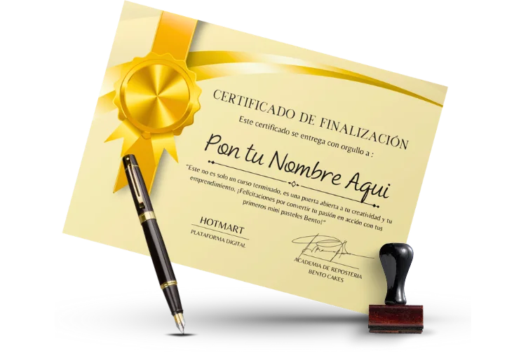 Al finalizar tu e-book, tendrás acceso al certificado de finalización, directamente en tu área exclusiva de estudiante, que acredita tu habilidad como repostera en bento cakes.
